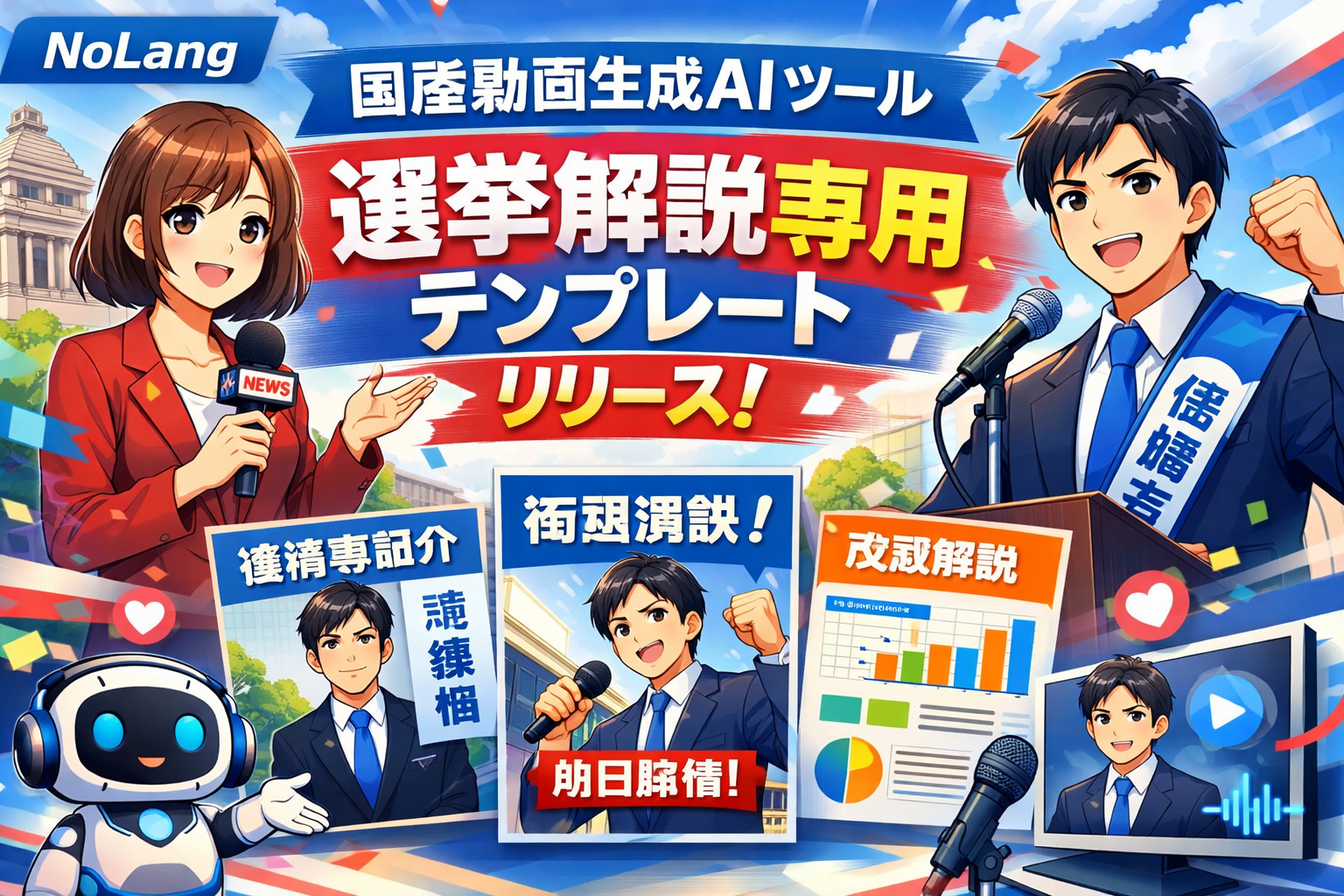 国産の動画生成AIツール「NoLang(ノーラン)」が、衆議院選挙2026向けの専用テンプレートを正式にリリースしました。